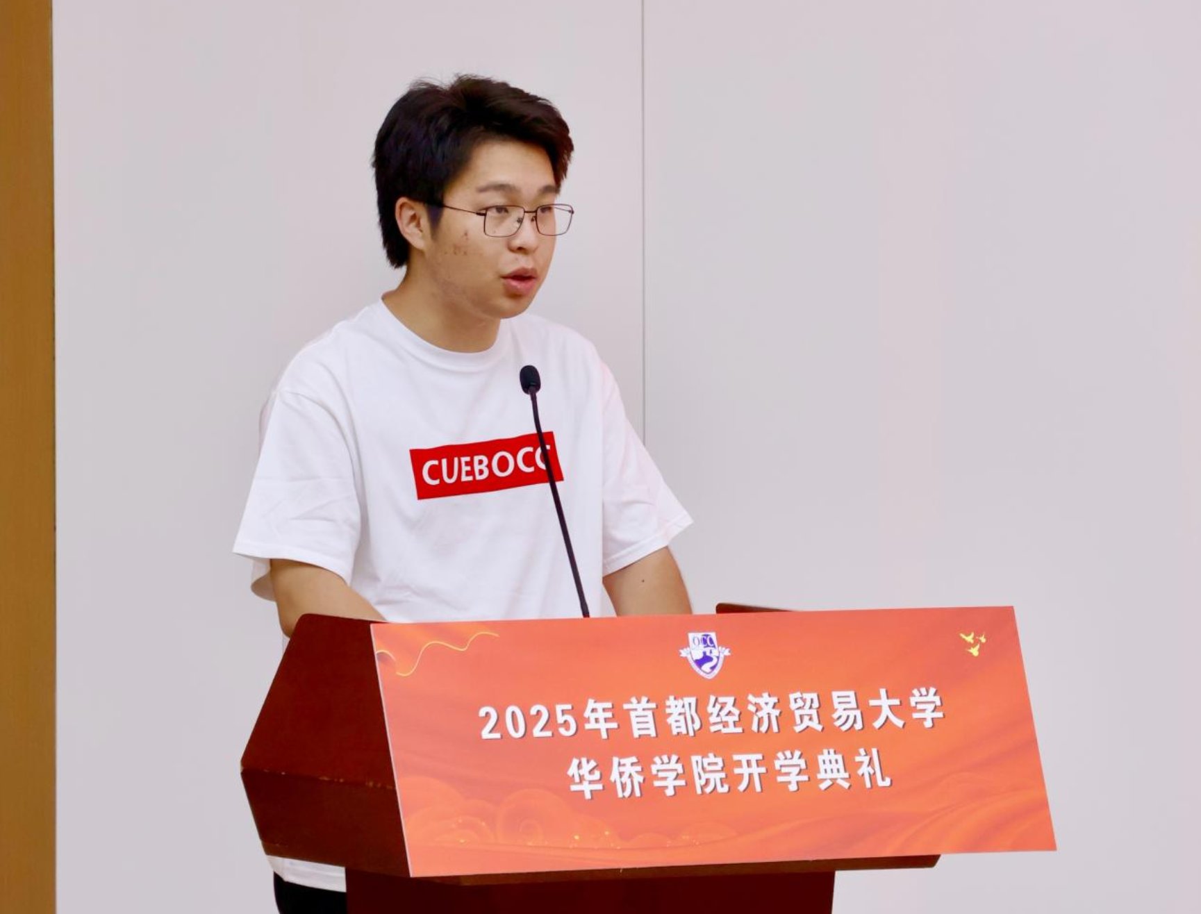2025级信息管理与信息系统(数据治理)2班的李昱诚同学代表新生上台发言。他表达了步入大学校园的激动与自豪,并分享了对未来大学生活的规划与期待。他提到,将秉承“崇德尚能,经世济民”的校训,刻苦学习,勇于探索,努力成长为有理想、有本领、有担当的首经贸人。