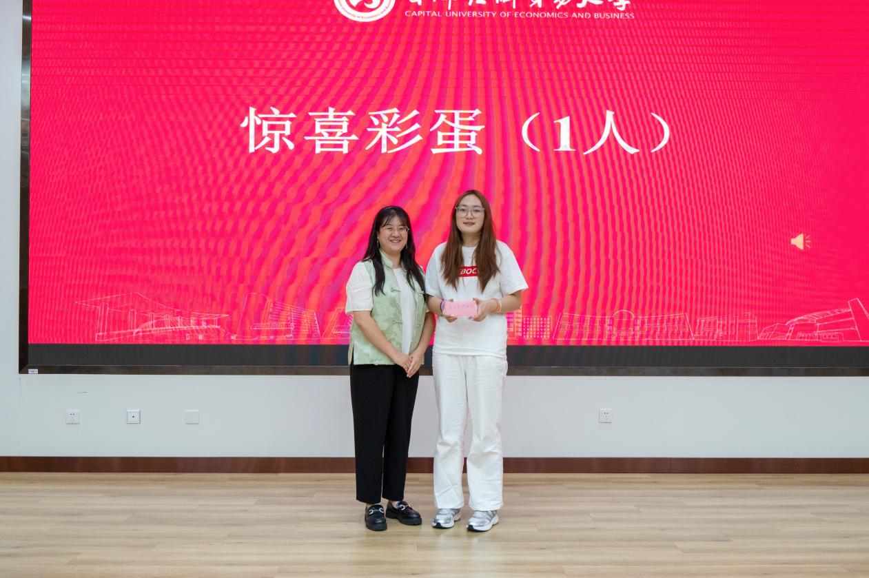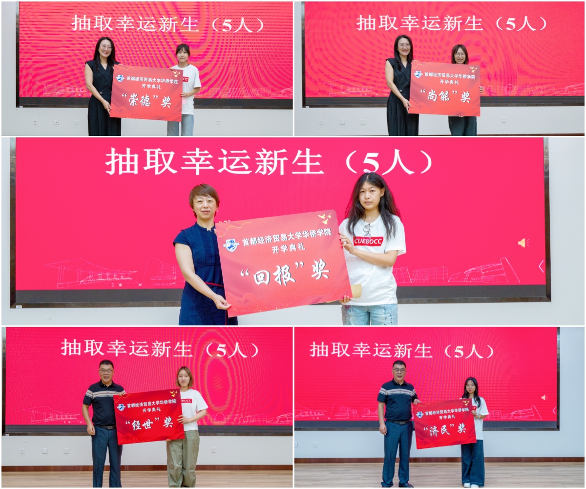 典礼还设置了幸运新生抽奖环节,五位幸运新生分别获得了“崇德”“尚能”“经世”“济民”“回报”奖项,奖品包括文化创意大礼包、体育馆健身卡、生涯导师推荐实习岗位、职业规划指导训练营名额等。学院领导崔颖、李百兴、兰君分别上台为幸运新生颁奖。