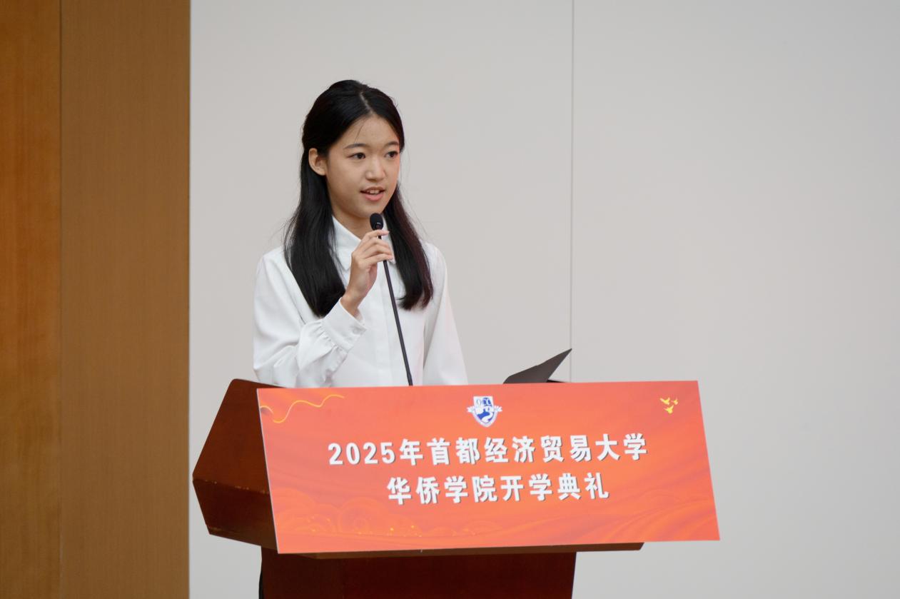 院学生会主席、2023级工商管理(国际会计)1班的吴霁纯同学作为在校生代表发言。她结合个人成长经历,为新生们提供了宝贵的建议。她表示,大学生要关注学习的自主性与探索性,鼓励新生们珍惜学院提供的国际化平台,积极参与社团活动和实践项目,全面提升自己的综合素质。