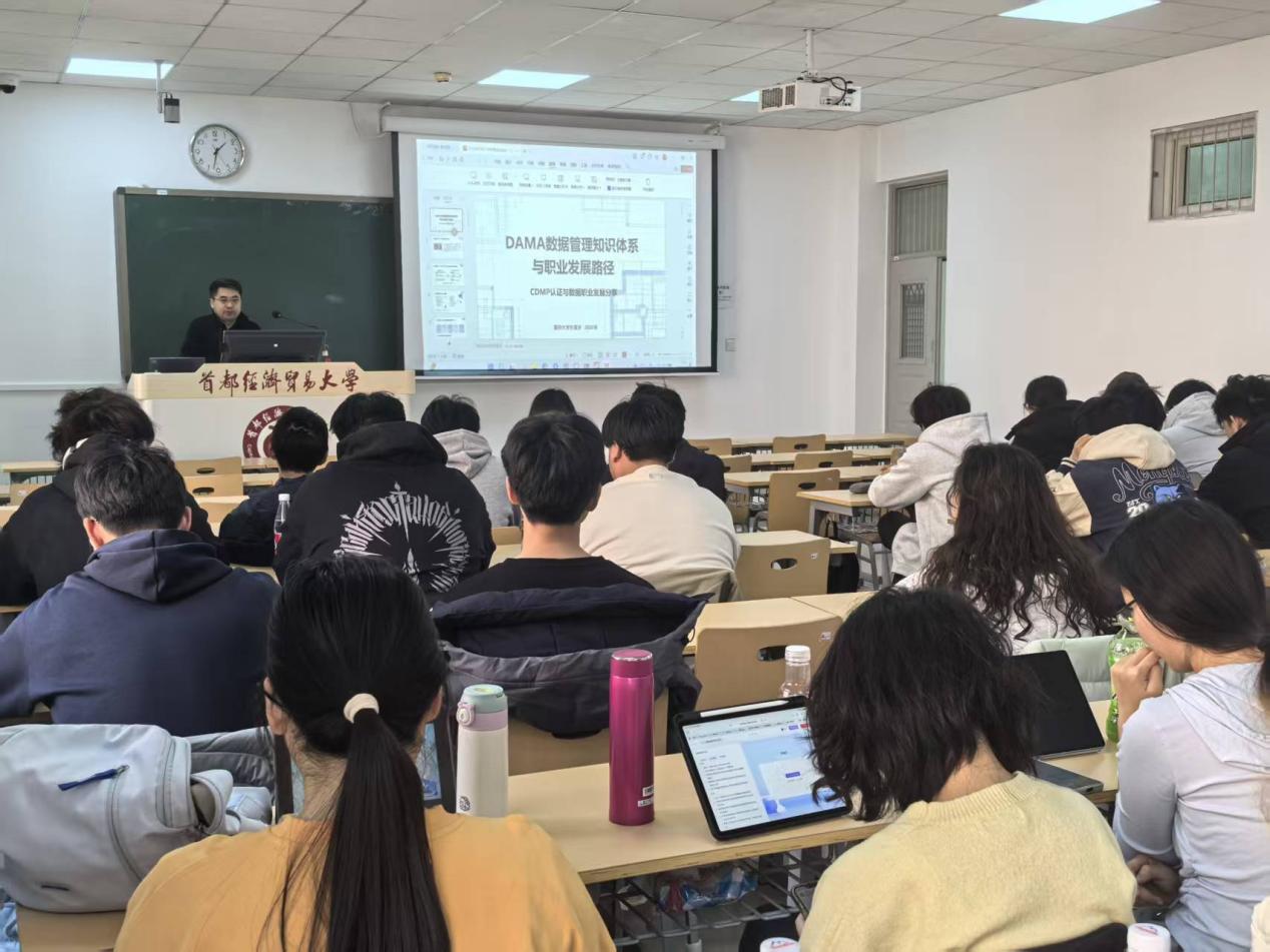 讲座围绕DMBOK知识体系、CDMP认证路径、数据治理行业发展趋势及数据岗位成长路线等内容展开。主讲人结合数字经济时代背景,系统阐释了数据作为新型生产要素的重要价值,指出数据治理已成为支撑组织数字化转型、提升决策效率、保障数据安全与合规管理的重要基础。围绕数据治理、数据架构、数据建模、数据质量、元数据管理、主数据管理、数据安全、数据仓库与商业智能等核心领域,主讲人对DAMA-DMBOK框架进行了系统讲解,帮助学生进一步建立对数据管理知识体系的整体认识。