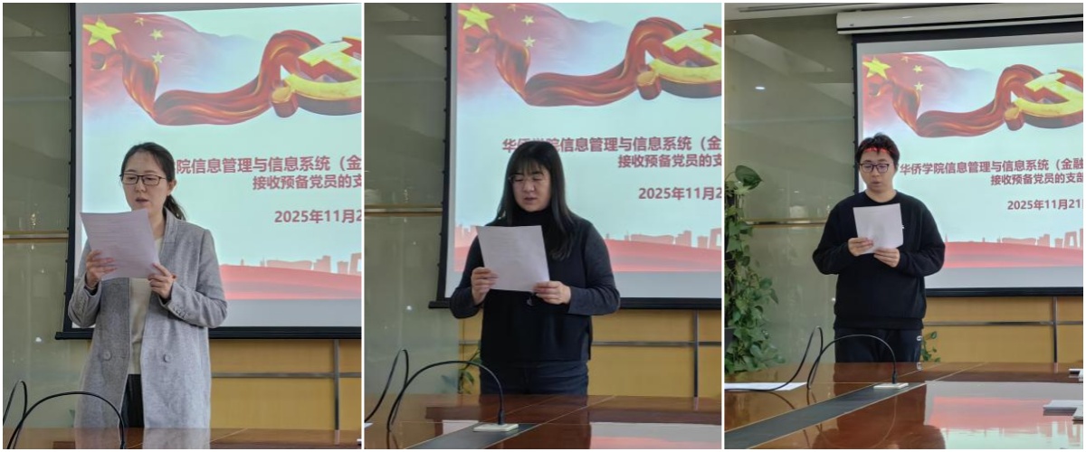 11月21日,华侨学院信息管理与信息系统(金融信息管理)学生党支部于启铸恭温楼C123召开预备党员接收大会。华侨学院党委副书记蔡丹、全体党员以及发展对象贾晨冉同志、沈晶晶同志参加此次大会。大会由党支部书记刘文静主持。