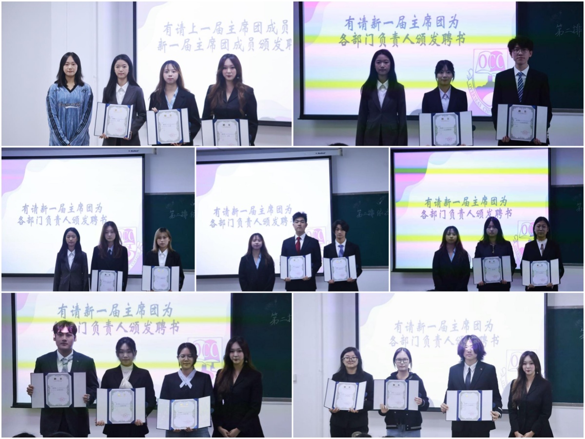会上,吴霁纯首先宣布了本届学生会成员名单。公章交接仪式随后举行,这一仪式象征着责任的传递。紧接着,谭睿佳为新一届主席团成员颁发聘书,新一届主席吴霁纯、黄羡贤、崔钰轩依次为办公室外联部、传媒部、宣传部、学习部、体育部、文艺部负责人颁发聘书。