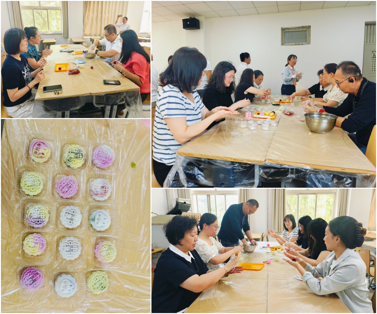 烘焙师首先演示了广式月饼的制作流程:从揉面、包馅到压模,每个步骤都蕴含着传统工艺的智慧。“面皮要中间厚边缘薄,这样包制时才不易露馅”,在专业指导下,平日站在讲台上的教师们化身烘焙学徒,揉搓、称量、包馅、压模,动作从生疏到熟练,一个个印有“美好”“团圆”“中秋”以及各色花纹的月饼逐渐成形。