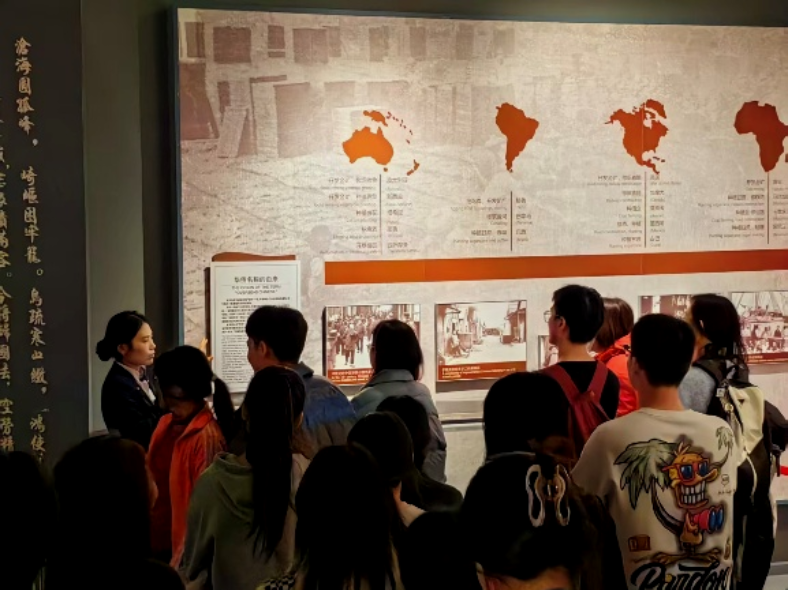 在讲解员的带领下,同学们依次参观了华侨华人历史文化展第一展厅和第三展厅。走进第一展厅,围绕中国人移民海外的历史主线,大家循着古代、近现代、当代三个时间维度缓缓前行。从古代海上丝绸之路的商贸往来与人口迁徙,到近现代战乱与生计所迫下的大规模移民浪潮,再到当代华侨华人以多元方式参与中外交流合作,一件件文物背后的故事让大家对海外移民的移徙方式、生存境遇与文化融合有了更立体的认知。